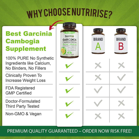 • POWERFUL APPETITE SUPPRESSANT: NutriRise Pure Garcinia Cambogia Supplement is a clinically-proven appetite suppressant and metabolism booster. These Garcinia Cambogia capsules will curb cravings, block carbohydrates and burn fat reserves by converting food into energy instead.*